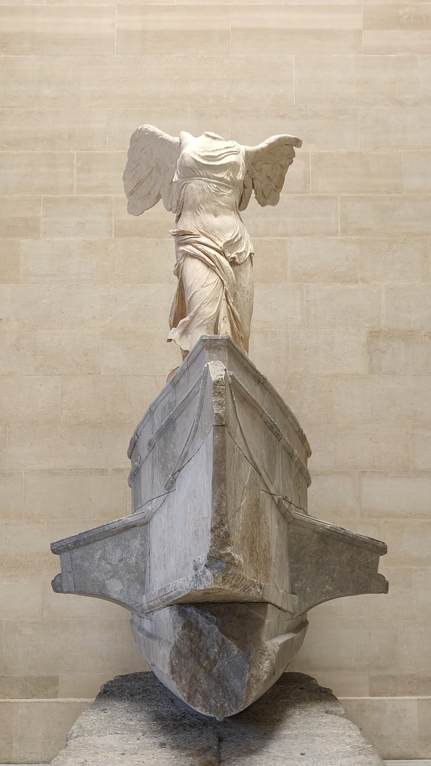 (Left) Winged Victory of Samothrace · It is displayed in a majestic manner, positioned on a platform with numerous steps and facing towards me as I turn right. This is my favorite one.